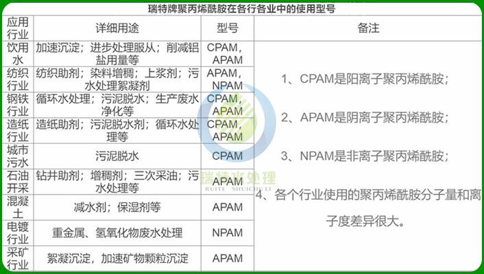 此圖介紹聚丙烯酰胺在各個行業(yè)中的應用型號: